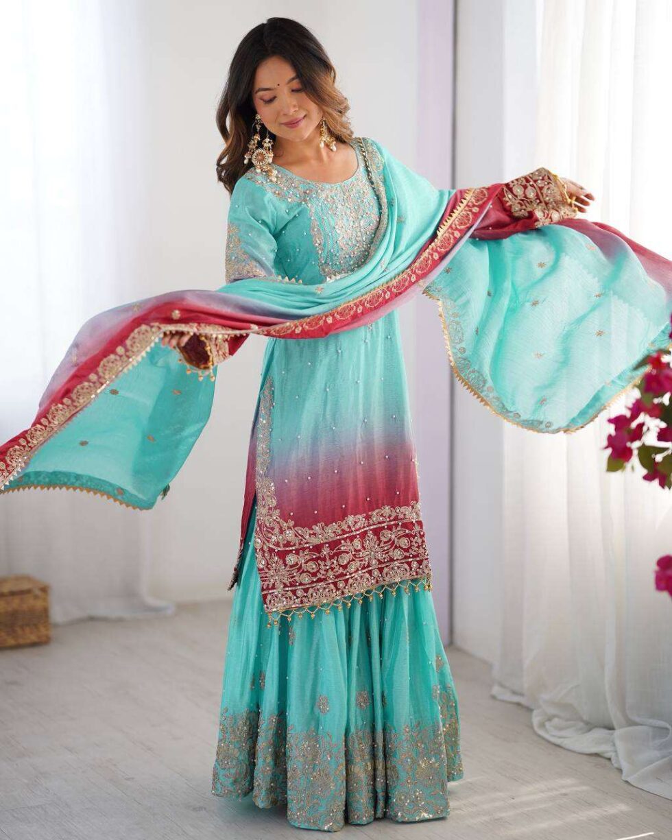 Women’s Chinon Silk Sequence With Rivet Moti Work Straight Kurta With Sharara and Dupatta Set